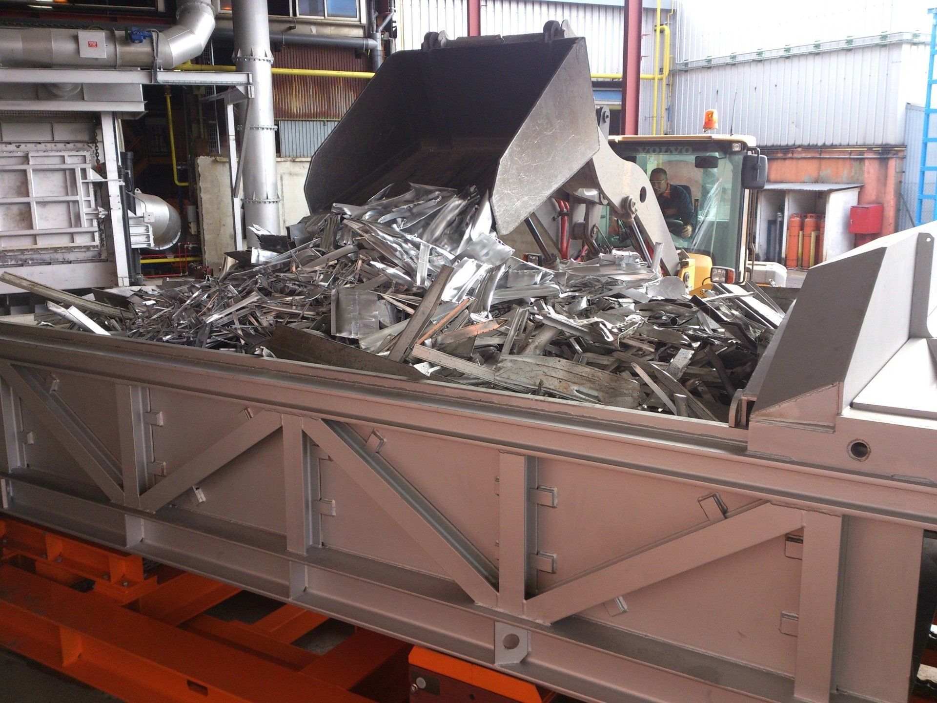 The RIA automated charging machine is composed of three rigid steel frame sections. The base of the rail guided car is the traveling frame with wheel blocks. It can be designed to travel in multiple directions. This frame is equipped with two laser systems. One, for precise placement of the unit in relationship to the furnace door and the second checking for obstacles or personnel in the way of the moving frame. The intermediated frame is connected to the traveling frame by load cells. The integrated load cells record charge weights and cumulate the charging cycle to a furnace weight. This provides immediate recovery information for process monitoring. Additionally, the intermediate frame is equipped with support, guiding and drive elements for the upper carriage. The upper carriage performs the actual charging cycle. The forward section is built as a container to accommodate up to 50 cubic metres of scrap or sows, weighting up to 20 tons. The actual dimensions will vary in relation to the furnace size. The upper carriage can be designed to swivel to allow scrap charging from various directions relative to the machine. The drive for the pusher is located at the back of the unit. During charging the container enters the open furnace. As soon as the container is fully extended the pusher starts to drop the material into the furnace. At the same time the retraction of the container starts simultaneously to distribute the Aluminum evenly over the bath area. This procedure assures the highest melt rates and the lowest metal losses.